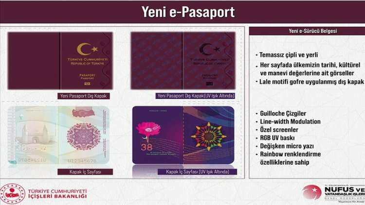 "Yeni yerli e-Pasaportumuz TÜBİTAK AKİS işletim sistemli temassız çipe ve birçok yeni güvenlik öğesine sahiptir" diyen Soylu, "Ayrıca yeni yerli e-Pasaportta Sayın Cumhurbaşkanımızın talimatlarıyla ilk kez 'Turkey' ifadesi yerine 'Türkiye' ifadesi yer alacaktır. Tasarımı özgün bir tasarımdır. Pasaportun her sayfasında ülkemizin farklı şehirlerine ait tarihi, kültürel ve manevi değerlerine yönelik görseller, şehre özel, her şehre ait özel bitki görseli yer alacak. Ayrıca yeni e-Pasaportlarda, daha önce 5 yıl olan yeşil pasaport geçerlilik süresi, yeni nesil yerli e-Pasaportla 10 yıla çıkıyor" diye konuştu.