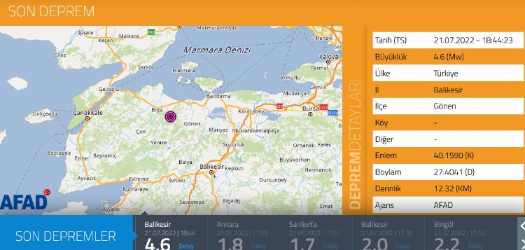 Kayıtlara Balıkesir'in Gönen ilçesi olarak geçen merkez üssü Tahtalı Mahallesi olan 4,6 büyüklüğünde deprem meydana geldi.