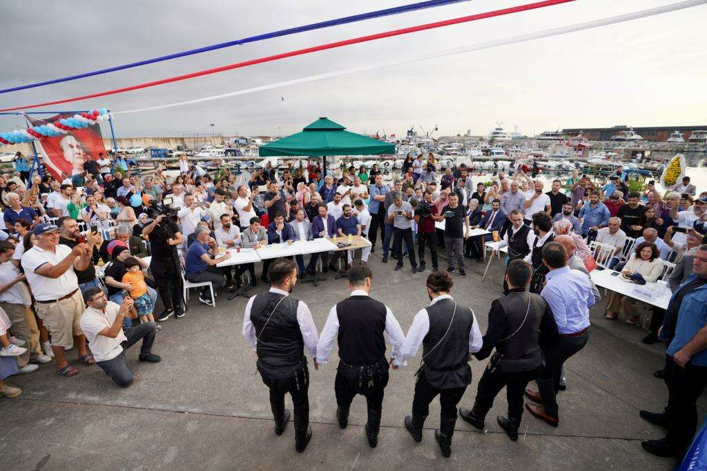 Tuzlalı balıkçılarla buluşan İmamoğlu, folklor ekibiyle horona durdu, balık tezgahında balık ekmek ikram etti.