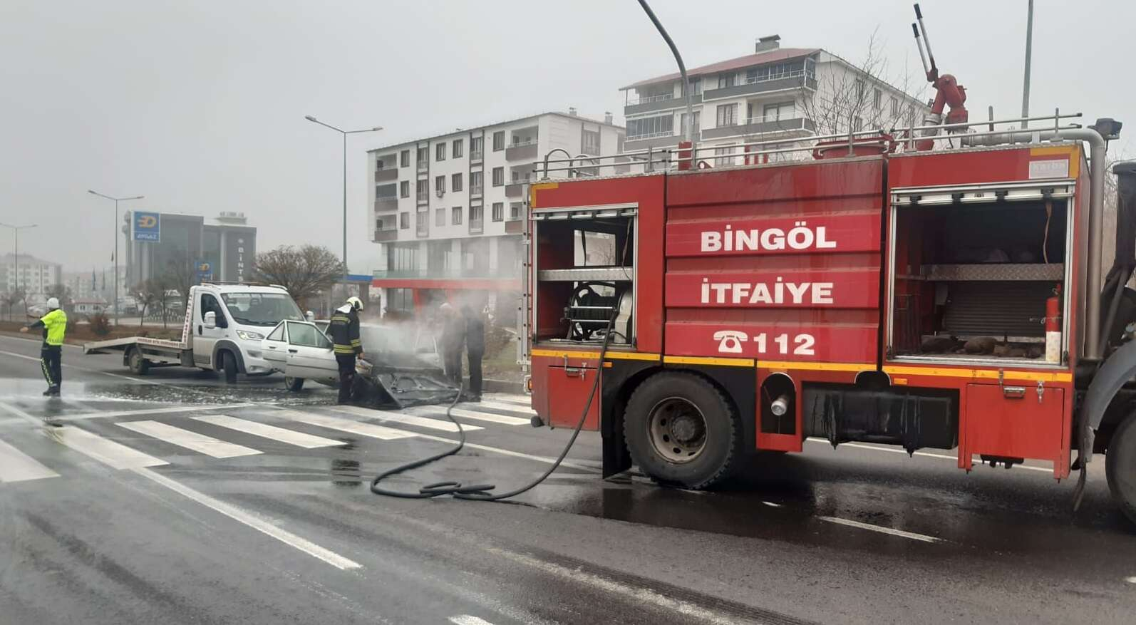 Bingöl'de Merkez Kaleönü Mahallesi2nde kırmızı ışıkta bekleyen otomobil alev aldı.