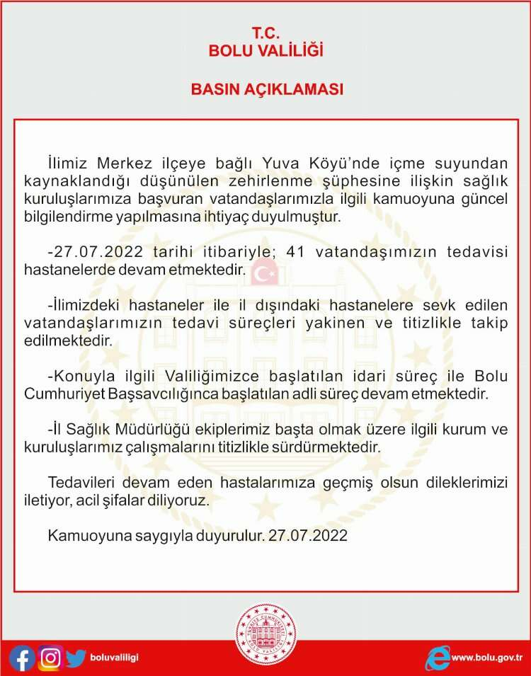 Valilik, vatandaşlarının bir bölümünün tedavisinin sürdüğünü belirtirken, Bolu'daki hastanelere başvuruların 24 Temmuz itibarıyla yapıldığı anımsatarak, hastaneye 2 gündür yeni başvuru gelmediği ve halen 41 kişinin tedavilerinin hastanelerde devam ettiğini kaydetti.