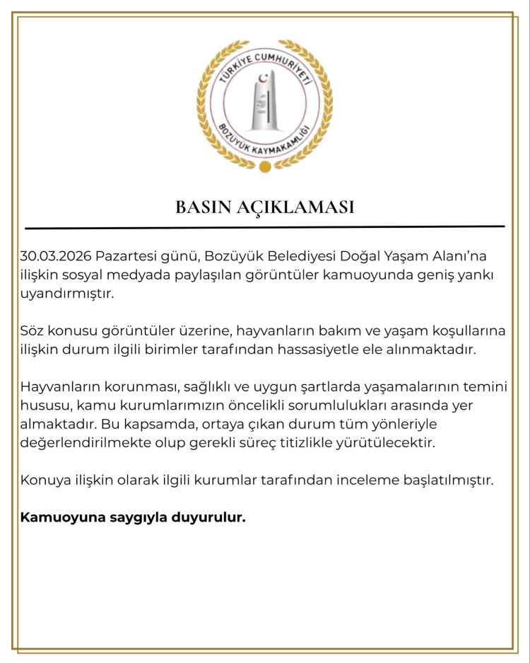 Pazaryeri Gündem / BİLECİK (İGFA) - Bilecik'in Bozüyük ilçesinde 30 Mart 2026 Pazartesi günü Bozüyük Belediyesi Doğal Yaşam Alanı’na ait sosyal medyada yayımlanan görüntüler kamuoyunda geniş yankı uyandırdı. Görüntülerdeki hayvanların yaşam koşullarına yönelik oluşan endişeler sonrasında Bozüyük Kaymakamlığı konuyla ilgili bir açıklama geldi.