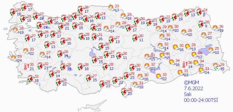 Salı günü Marmara, İç Anadolu, Akdeniz, Batı ve Doğu Karadeniz ile Ege'nin iç kesimlerinde gök gürültülü sağanak etkili olacak. Kalan kesimlerde parçalı ve az bulutlu havanın hakim olması bekleniyor.