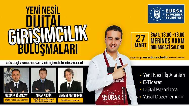 Merinos Atatürk Kongre ve Kültür Merkezi Orhangazi Salonu’nda 27 Mart Pazar günü yapılacak ve katılımın ücretsiz olduğu program, saat 13.00’da başlayacak. Türkiye Odalar ve Borsalar Birliği Türkiye E-Ticaret Meclisi Danışmanı Adnan Akgün ve Dijital Pazarlama Uzmanı Mustafa Sönmezay, Dijital Girişimcilik ve Yeni Nesil İş Alanları, Türkiye'nin Girişimcilik Haritası, Proje ve Fikir Geliştirme Süreçleri, İnfluencer (Etkileyici) Pazarlama, Sosyal Medya Pazarlama, E-Ticaret Yönetimi, E-ihracat, Dijital Pazarlama, Pazaryeri, Yasal Düzenlemeler, Şirket Kuruluşu ve Dijital Girişim Başarı Hikâyeleri hakkında sunum yapacak.