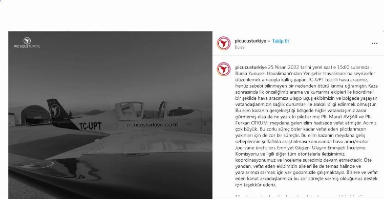 BURSA (İGFA) - Bursa'nın Osmangazi ilçesinde dün yaşanan ve iki pilotun ölümüne neden olan uçak kazasıyla ilgili uçağın bağlı olduğu havayolu şirketi PIC Uçuş Türkiye'den açıklama geldi.