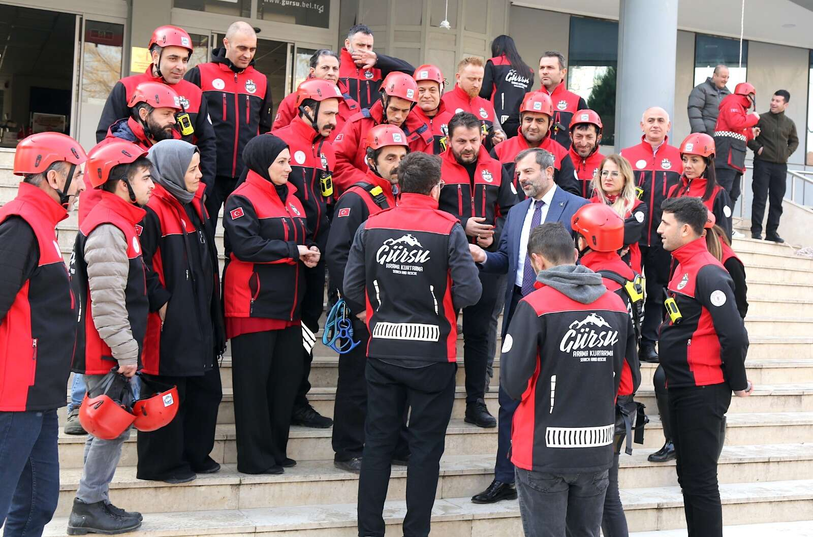 Tatbikat kapsamında yönlendirmeleri uygulayarak binadan çıkan Gürsu Belediye Başkanı Mustafa Işık ve personeller de, belediye hizmet binası önünde gerçekleştirilen yangın söndürme tatbikatına da uygulamalı olarak katıldı. Tatbikat kapsamında, yaralı bir kişi de sedyeyle binadan çıkarıldı. Arama kurtarma faaliyetleri kapsamında yapılan uygulama örneği olarak, arama kurtarma ekibinden iki kişinin belediye hizmet binasının çatısından iple inerek açtıkları Türk bayrağının önünde çekilen toplu fotoğrafla tatbikat sonlandırıldı.