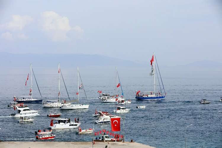 Arnavutköy Balıkçı Barınağı’ndan denize açılan teknelerin Güzelyalı ve Mudanya sahili arasındaki kıyı seyrine, halkın katılımı için de İzzet Kaptan gezi gemisi eşlik etti. Vatandaşlar denizdeki korteji bayrak sallayarak ve alkışlarla selamlarken, vatandaşların ilgisine denizciler de düdük ve siren sesleri karşılık verdi.