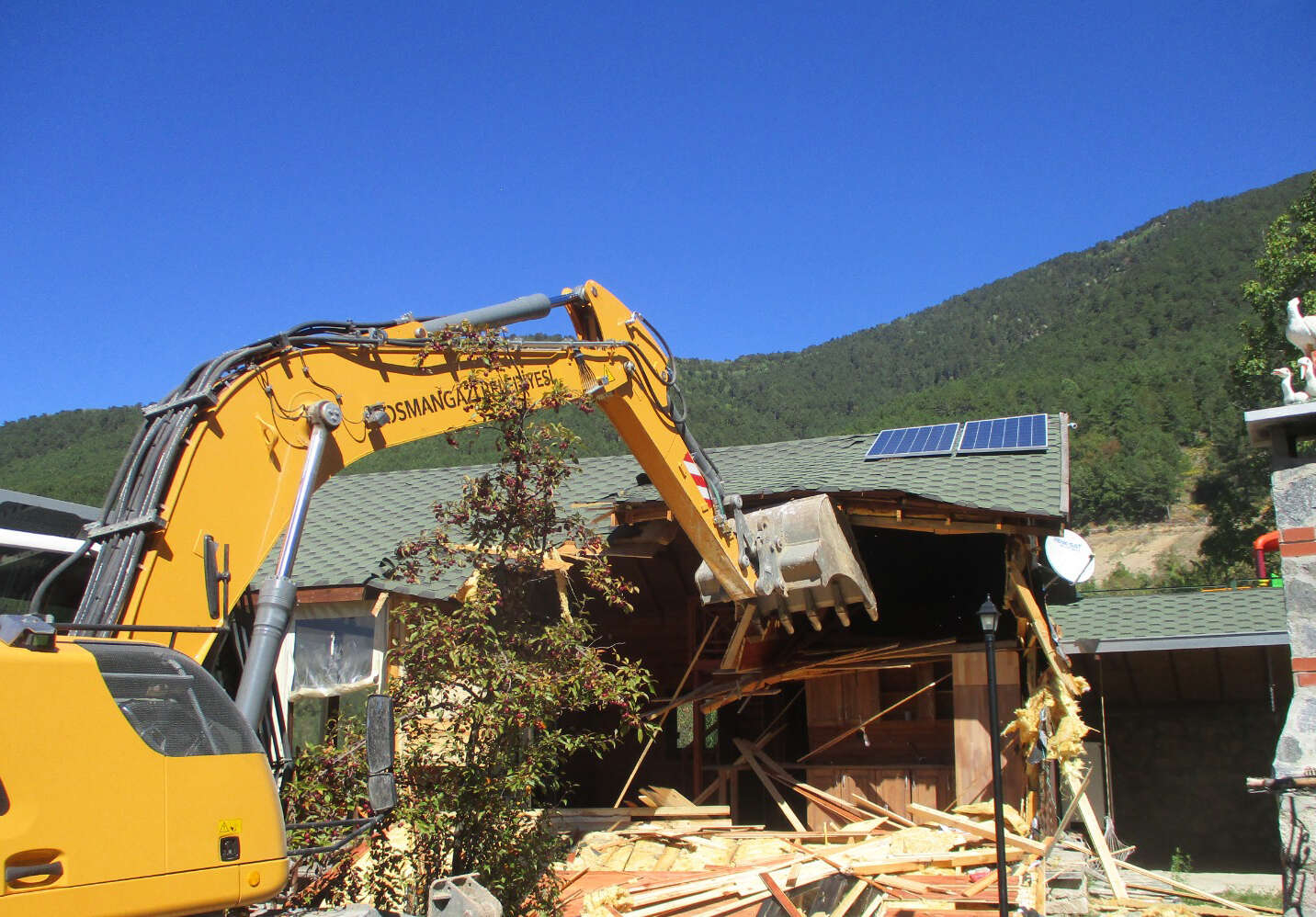 Bursa'da Osmangazi Belediyesi, Bağlı Mahallesi’nde tarım arazisi üzerine kaçak olarak inşa edildiği belirlenen bungalov tarzı ahşap evi yıktı.