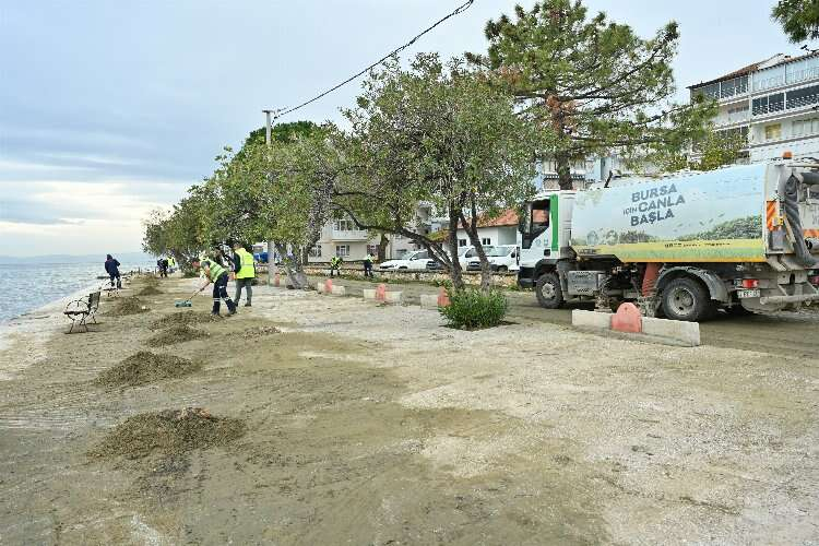 Bursa’nın birçok noktasında hafta sonu etkili olan fırtına ve yağış en çok Gemlik ilçesi sahilinde etkili olurken, Büyükşehir Belediyesi ekipleri, fırtına ve taşkınların verdiği zararın etkilerini ortadan kaldırmak için seferberlik başlattı.