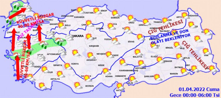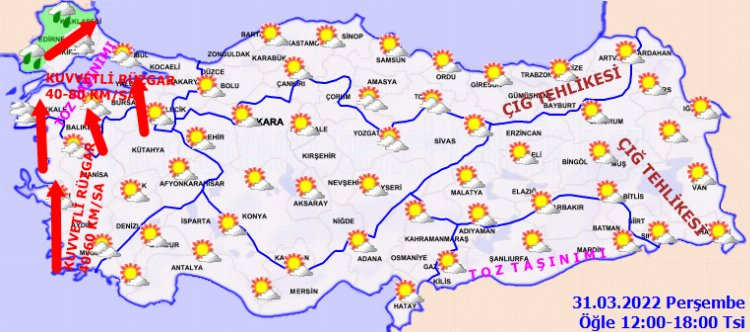 Öte yandan Türkiye'nin doğu ve kuzeybatı kesimlerinin parçalı ve çok bulutlu, Edirne, Kırklareli, Çanakkale, İzmir, Manisa, Kütahya ve Eskişehir çevrelerinin yağmur ve sağanak yağışlı, diğer yerlerin az bulutlu ve açık geçeceği tahmin ediliyor. Karadeniz'in iç ve yüksek kesimleri ile Doğu Anadolu'da yüksek kar örtüsüne sahip eğimli bölgelerde çığ riski bulunduğunu açıkladı.