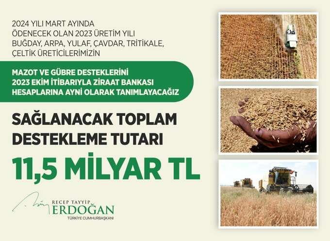 Erdoğan, son mesajını de üreticilere vererek, 2024 yılı Mart ayında ödenecek 2023 buğday, arpa, yulaf, çavdar tritikale, çeltik üreticilerinin mazot, gübre destekleri gibi ödemeleri öne çekerek üreticilerin yanında olacaklarını ve toplam 11,5 milyar lira desteği Ekim ayından itibaren hesaplara aktarmaya başlayacaklarını belirtti.