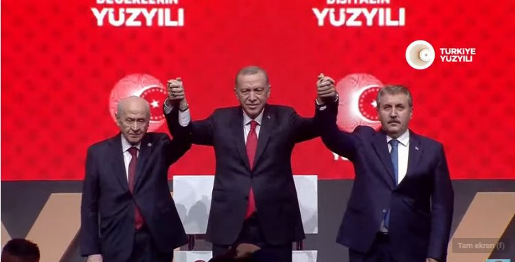 Cumhurbaşkanı Erdoğan konuşması sonrasında sahneye Cumhur İttifakı ortakları MHP Genel Başkanı Devlet Bahçeli ile BBP Genel Başkanı Mustafa Destici'yi de davet ederek, birliktelik pozu verdi.