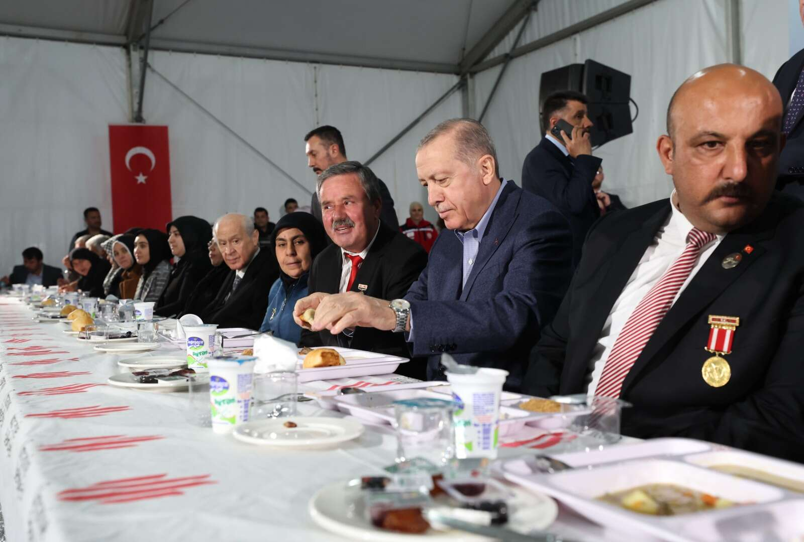 ANKARA (İGFA) - Cumhurbaşkanı Recep Tayyip Erdoğan, beraberindeki MHP Genel Başkanı Devlet Bahçeli ve BBP Genel Başkanı Mustafa Destici ile 6 Şubat'ta depremlerin merkez üssü Kahramanmaraş'taki Karacasu Konteyner Kent'te şehit, gazi ve depremzede ailelerle iftar yaptı.