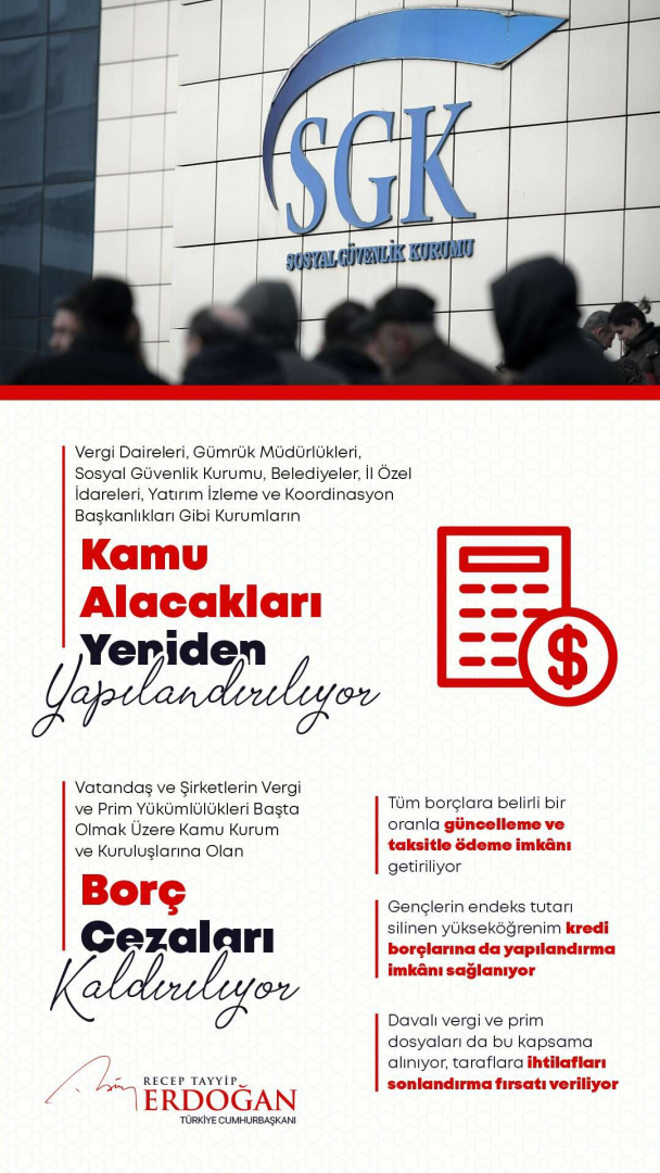 "Vatandaşlarımızın ve şirketlerimizin, vergi ve prim yükümlülükleri başta olmak üzere kamu kurum ve kuruluşlarımıza olan borçlarının cezalarını kaldırıyoruz" diyen Cumhurbaşkanı Erdoğan, "Kapsamlı bir uygulama olan yapılandırma teklifimizin tüm hak sahiplerine hayırlı olmasını diliyorum" dedi.