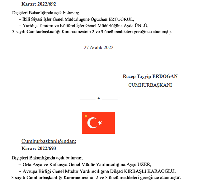 Buna göre, Dışişleri Bakanlığı'nda açık bulunan İkili Siyasi İşler Genel Müdürlüğü'ne Oğuzhan Ertuğrul, Yurtdışı Tanıtım ve Kültürel İşler Genel Müdürlüğü'ne Ayda Ünlü, Orta Asya ve Kafkasya Genel Müdür Yardımcılığına Ayşe Uzer ve Avrupa Birliği Genel Müdür Yardımcılığına Dilşad Kırbaşlı Karaoğlu atandı.