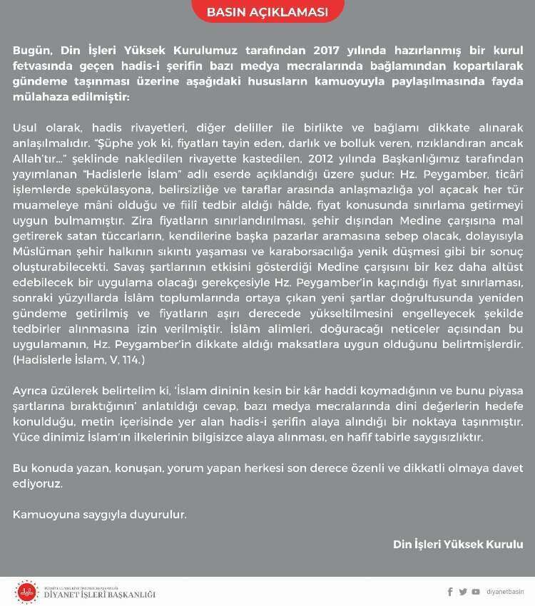 Hatırlanacağı gibi, Diyanet İşleri Başkanlığı’nın dini konulardaki en yüksek karar ve danışma organı olan Din İşleri Yüksek Kurulu, “Ticarette kâr haddi var mı” sorusuna 'Fiyatları tayin eden Allah’tır' yanıtını verdi.