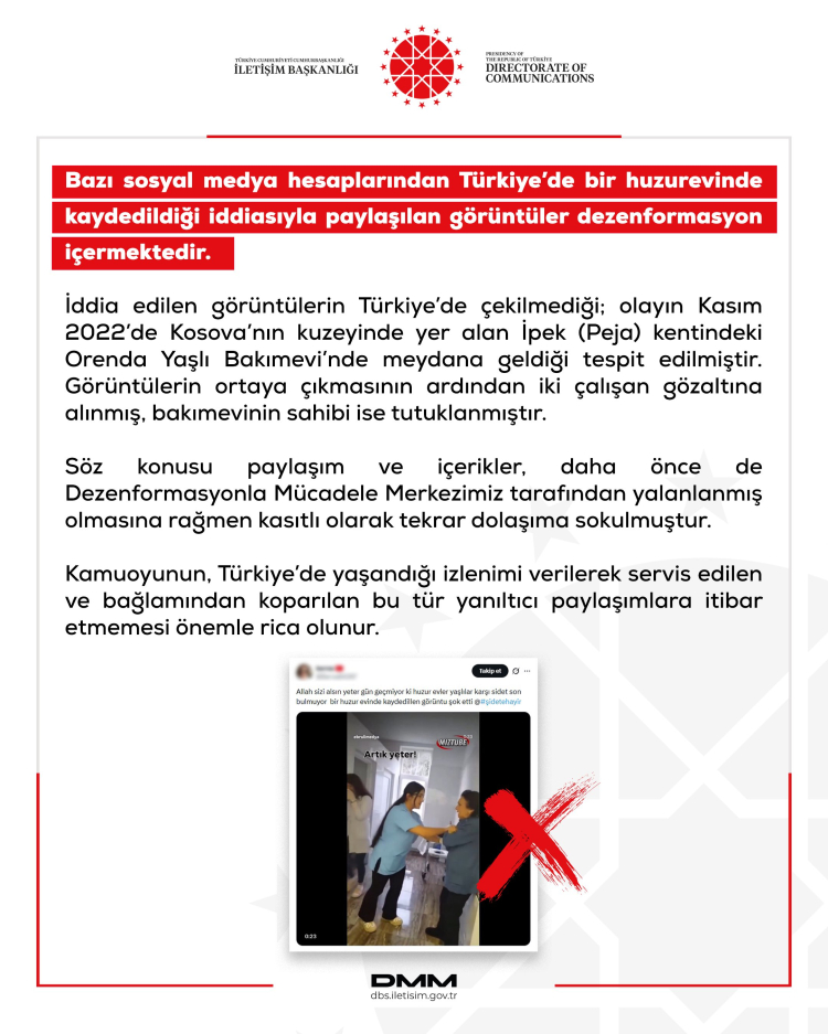 ANKARA (İGFA) - İletişim Başkanlığı bünyesindeki Dezenformasyonla Mücadele Merkezi, bazı sosyal medya paylaşımlarında Türkiye’de bir huzurevinde kaydedildiği öne sürülen görüntülerin gerçek dışı olduğunu duyurdu. Yapılan açıklamaya göre, söz konusu görüntüler Kasım 2022’de Kosova’nın kuzeyindeki İpek (Peja) kentinde yer alan Orenda Yaşlı Bakımevi’nde çekildi.