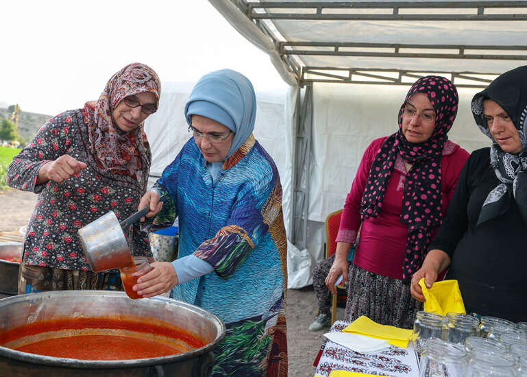 Emine Erdoğan, daha sonra çiftçi kadınların kışlık menemen yapımına eşlik etti.