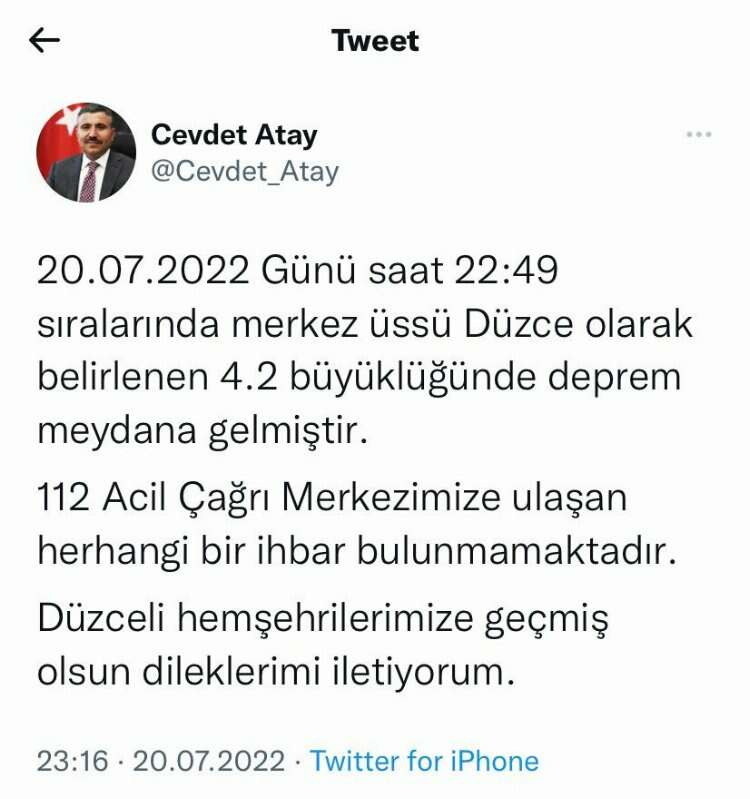 Vali Atay yaptığı paylaşımda, "20.07.2022 Günü saat 22:49 sıralarında merkez üssü Düzce olarak belirlenen 4.2 büyüklüğünde deprem meydana gelmiştir. 112 Acil Çağrı Merkezimize ulaşan herhangi bir ihbar bulunmamaktadır. Düzceli hemşehrilerimize geçmiş olsun dileklerimi iletiyorum" ifadelerine yer verdi.