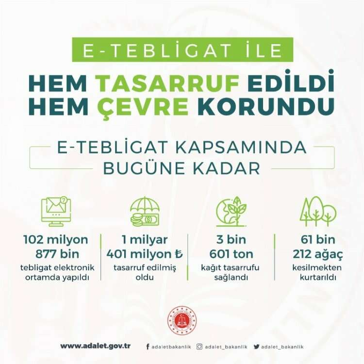 Çevre dostu e-tebligat uygulamasıyla bugüne kadar 102 milyon 877 bin 373 tebligat elektronik ortamdan iletildi. Fiziki tebligat yerine maliyeti daha az olan elektronik tebligatla tasarrufa da geçildi. Uygulamayla bugüne kadar 1 milyar 400 milyon 998 bin 495 lira tasarruf sağlandı. Ayrıca tebligatların elektronik ortamdan gönderilmesiyle 3 bin 601 ton kağıt tasarrufu elde edildi, 61 bin 212 ağaç korundu.