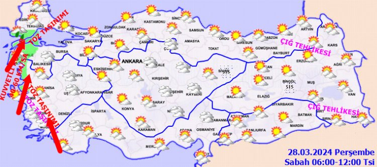 Marmara ve Ege’de yer yer toz taşınımı beklendiğinden yaşanabilecek olumsuz şartlara karşı dikkatli ve tedbirli olunması istenirken, rüzgarın, Yurdun batı kıyılarında güneyli yönlerden kuvvetli olarak (40-60 km/saat) esmesi bekleniyor. Ayrıca Doğu Karadeniz’in iç kesimleri ile Doğu Anadolu’nun kuzey ve doğusunda yüksek kar örtüsüne sahip eğimli yamaçlarda çığ tehlikesi bulunduğundan dikkatli ve tedbirli olunması istendi.