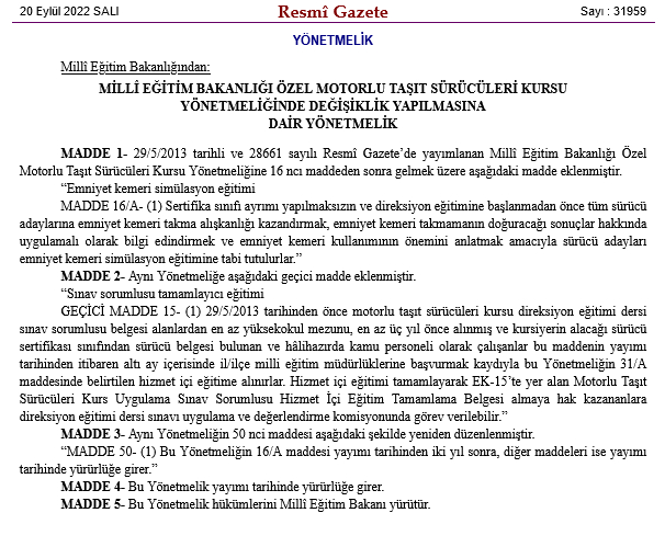 Buna göre, 29/5/2013 tarihinden önce motorlu taşıt sürücüleri kursu direksiyon eğitimi dersi sınav sorumlusu belgesi alanlardan en az yüksekokul mezunu, en az üç 3 önce alınmış ve kursiyerin alacağı sürücü sertifikası sınıfından sürücü belgesi bulunan ve hâlihazırda kamu personeli olarak çalışanlar bu maddenin yayımı tarihinden itibaren 6 ay içerisinde il/ilçe milli eğitim müdürlüklerine başvurmak kaydıyla bu Yönetmeliğin 31/A maddesinde belirtilen hizmet içi eğitime alınacakları kaydedildi.