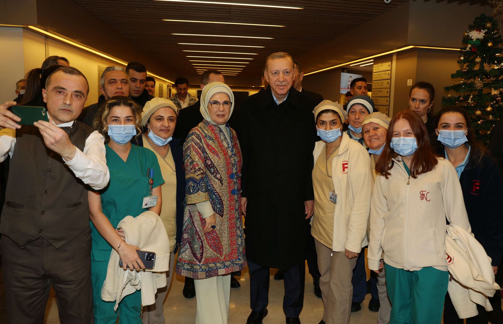 İletişim Başkanlığı'ndan aktarılan habere göre, hastanede hasta ziyaretinde bulunan ve hasta yakınlarıyla sohbet eden Cumhurbaşkanı Erdoğan ve eşi Emine Erdoğan, vatandaşlarla ve hastane personeliyle fotoğraf çektirdi.