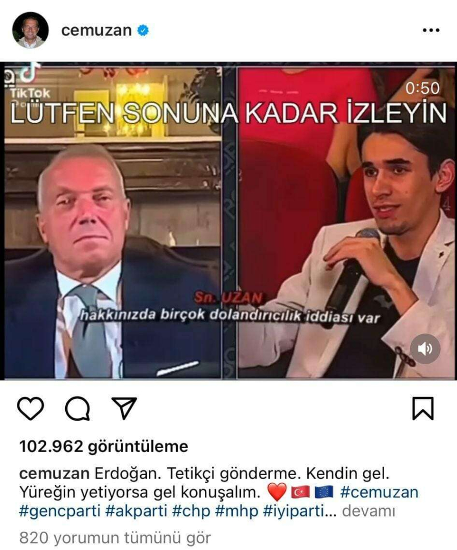 Uzan, kendi sosyal medya hesaplarında gazeteci İmanov ile ilgili ‘’Erdoğan tetikçi gönderme kendin gel konuşalım’’ ifadesini kullandı.