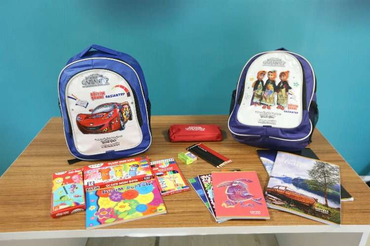 Gaziantep Büyükşehir Belediyesi buna göre Gaziantep’te merkez ve ilçelerdeki tüm okullarda 75 bin 1’inci sınıf öğrencisine hediye edeceği okul çantasıyla birlikte, 12 renkli sulu boya, 6’lı siyah kurşun kalem, silgi, kalemtıraş, kalem kutusu, 12 renkli pastel boya, A5 kareli defter, güzel yazı defter, A5 çizgili okul defteri, resim defteri, A4 kareli defter, A4 çizgili okul defteri, 12 renkli kuru tahta boya, 3’lü kırmızı kurşun kalemi 5 Eylül’de öğrencilerin masalarında hazır bulunacak.