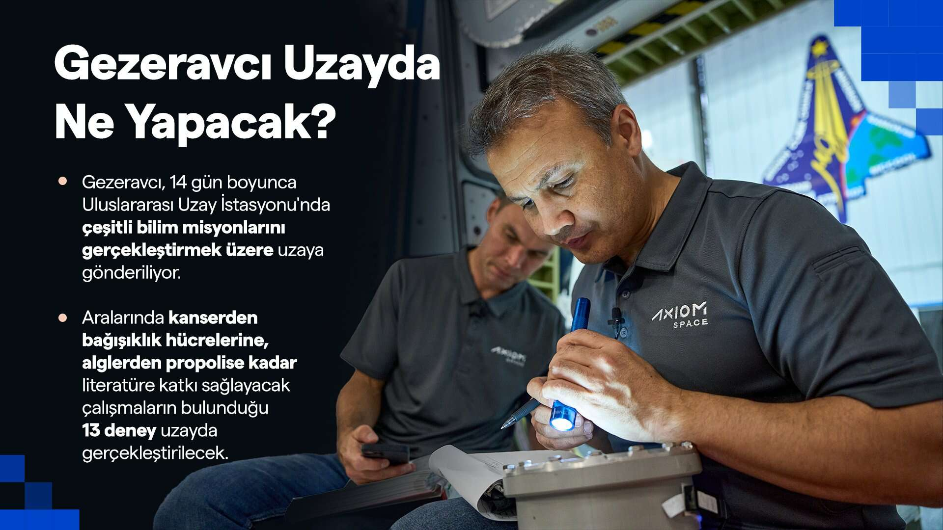 Gezeravcı, 14 gün boyunca 13 bilimsel deneyi gerçekleştirecek.