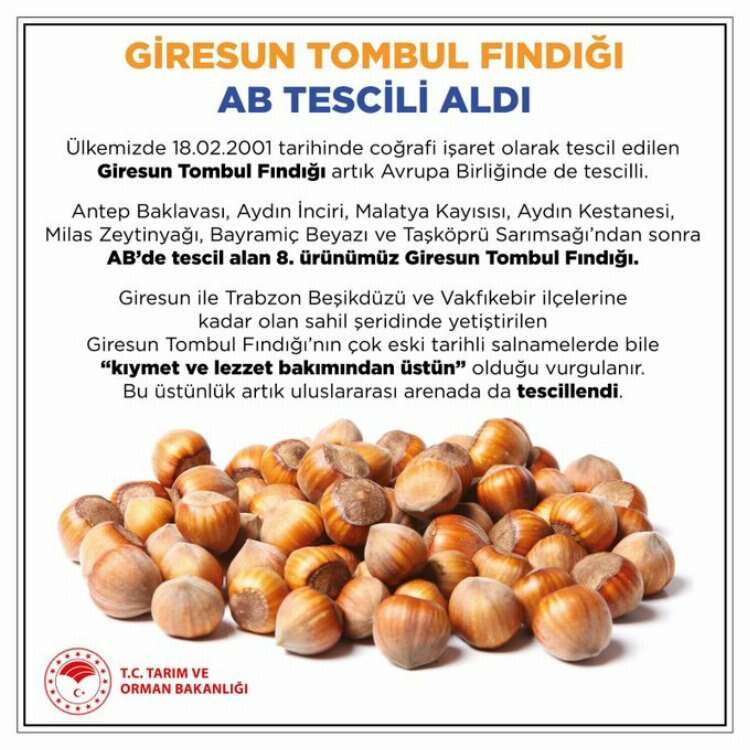 18 Şubat 2001 tarihinde coğrafi işaret olarak tescil edilen Giresun Tombul Fındığı'nın artık Avrupa Birliği'nde de tescilli olduğu kaydedilen açıklamada, "Antep baklavası, Aydın inciri, Malatya kayısısı, Aydın kestanesi, Milas zeytinyağı, Bayramiç Beyazı ve Taşköprü sarımsağından sonra AB'de tescil alan 8'inci ürünümüz Giresun Tombul Fındığı. Giresun ile Trabzon Beşikdüzü ve Vakfıkebir ilçelerine kadar olan sahil şeridinde yetiştirilen Giresun Tombul Fındığı'nın çok eski tarihli salnamelerde bile 'kıymet ve lezzet bakımından üstün' olduğu vurgulanır. Bu üstünlük artık uluslararası arenada da tescillendi" ifadelerine yer verildi.