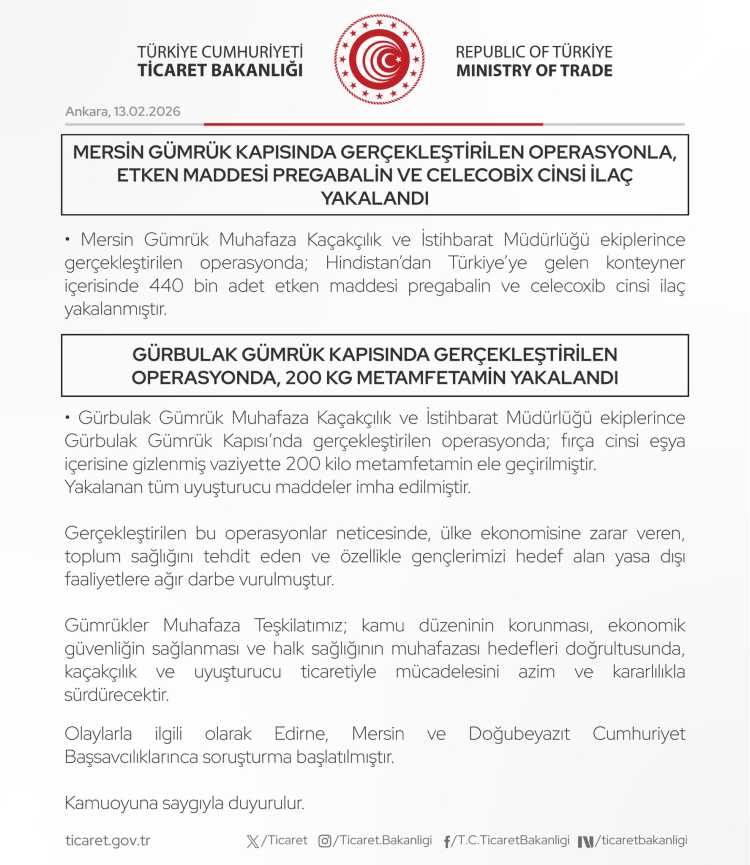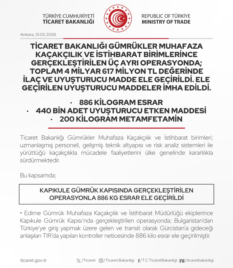 Ticaret Bakanlığı Gümrükler Muhafaza ekiplerinin üç ayrı gümrük kapısında düzenlediği operasyonlarda toplam 4 milyar 617 milyon TL değerinde uyuşturucu madde ve kaçak ilaç ele geçirildi. Yakalanan uyuşturucular imha edildi.