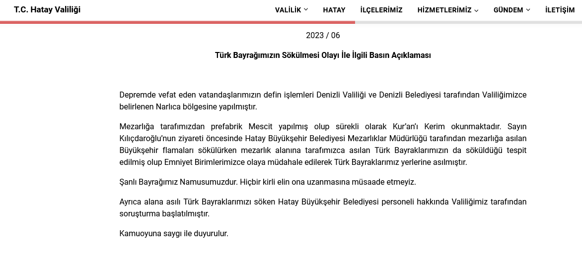 Hatay Valiliği tarafından mezarlığa yapılan prefabrik mescit yapıldığı ve burada sürekli Kur'an-ı Kerim okunduğu kaydedilen açıklamada, "Sayın Kılıçdaroğlu'nun ziyareti öncesinde Hatay Büyükşehir Belediyesi Mezarlıklar Müdürlüğü tarafından mezarlığa asılan Büyükşehir flamaları sökülürken mezarlık alanına tarafımızca asılan Türk bayraklarımızın da söküldüğü tespit edilmiş olup emniyet birimlerimizce olaya müdahale edilerek Türk bayraklarımız yerlerine asılmıştır. Şanlı bayrağımız namusumuzdur. Hiçbir kirli elin ona uzanmasına müsaade etmeyiz. Ayrıca, alana asılı Türk bayraklarımızı söken Hatay Büyükşehir Belediyesi personeli hakkında valiliğimiz tarafından soruşturma başlatılmıştır." ifadeleri yer aldı.