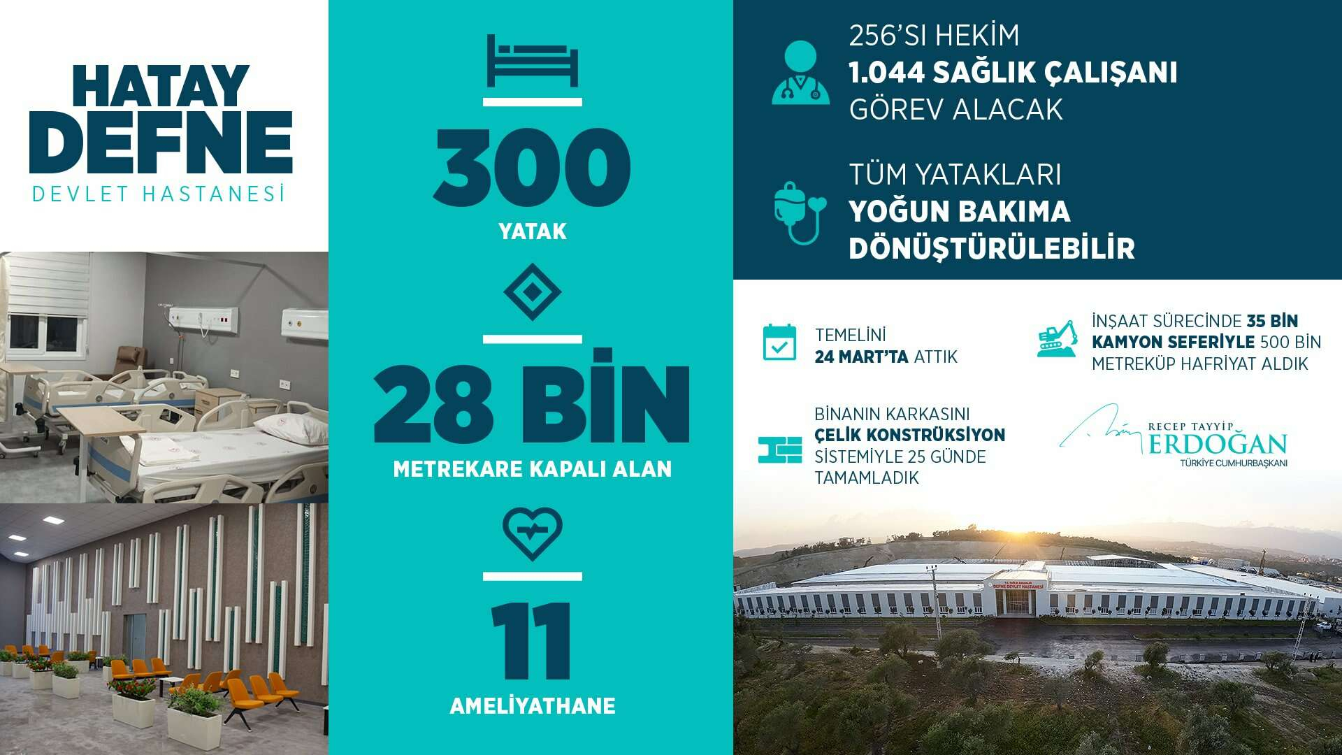 "Defne Hastanesi’yle ilgili bir fotoğraf karesi üzerinden kem söz söyleyenlerin hepsini de mahcup ederek, aradan 2 ay bile geçmeden inşaatı bitirdik" diyen Cumhurbaşkanı Erdoğan, "Hastanemiz depremzede kardeşlerimize hayırlı, uğurlu olsun" dedi.