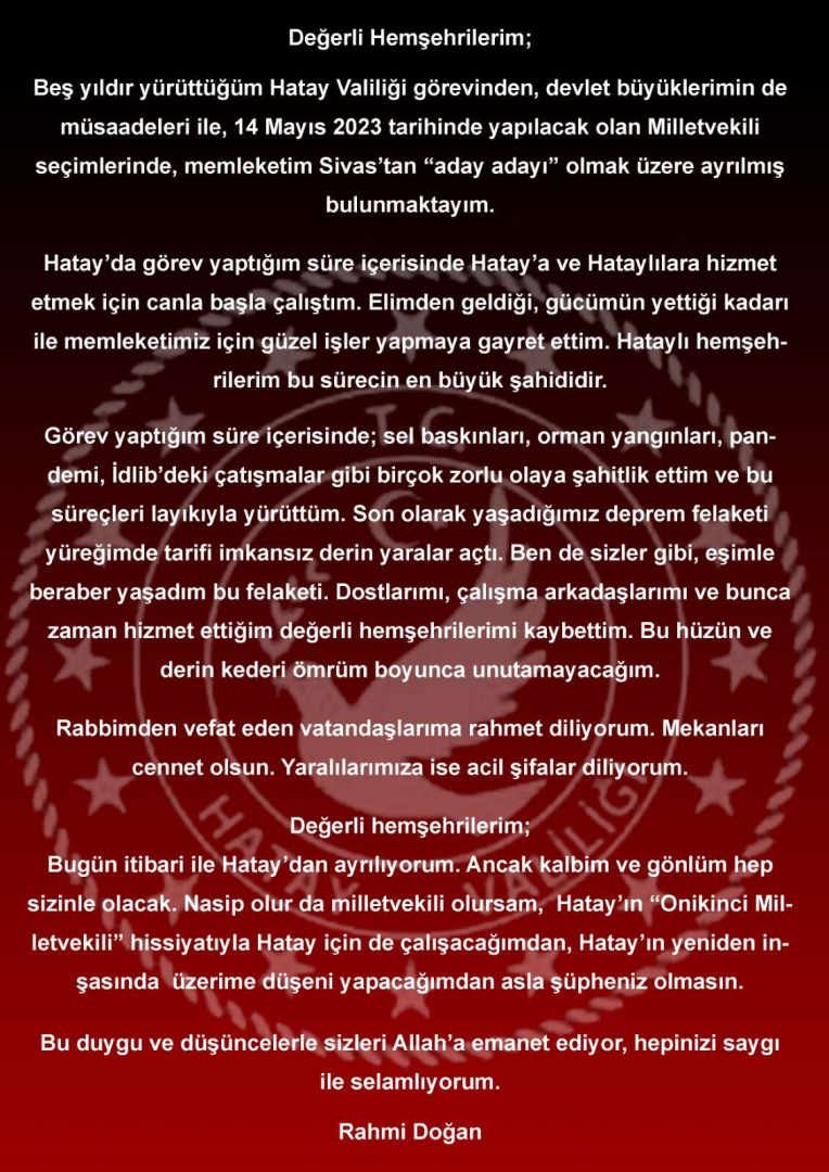 14 Mayıs'ta yapılacak olan milletvekili ve Cumhurbaşkanlığı seçimleri öncesi başvuru nedeniyle görevinden istifa ettiğini sosyal medya hesabından duyuran Rahmi Doğan, "5 yıldır yürüttüğüm Hatay Valiliği görevinden, devlet büyüklerimin de müsaadeleri ile, 14 Mayıs 2023 tarihinde yapılacak olan Milletvekili seçimlerinde, memleketim Sivas'tan 'aday adayı' olmak üzere ayrılmış bulunmaktayım" dedi.