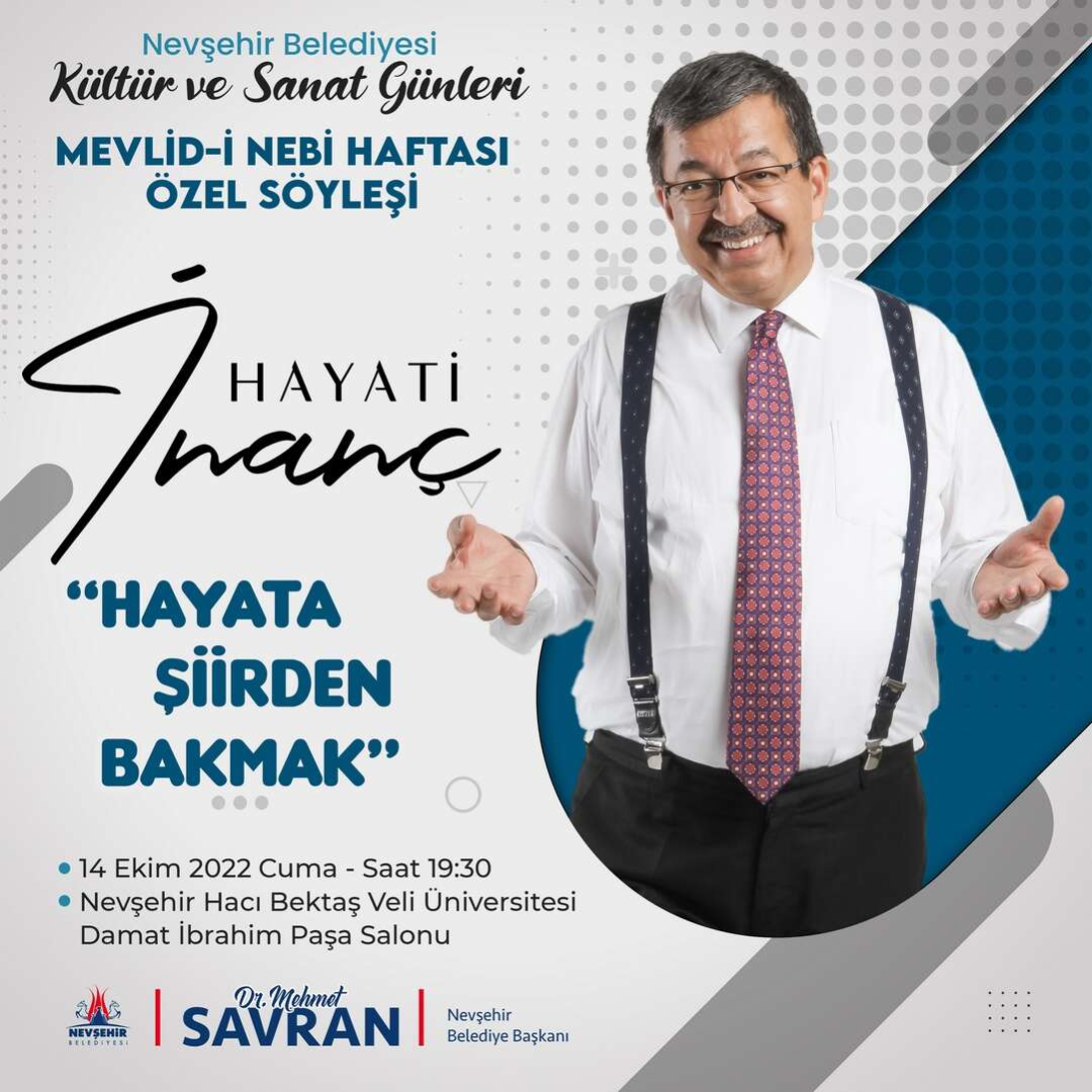 Nevşehir Belediyesi tarafından düzenlenen Mevlid-i Nebi Haftası Özel Söyleşi programının konuğu ünlü yazar Hayati İnanç olacak.