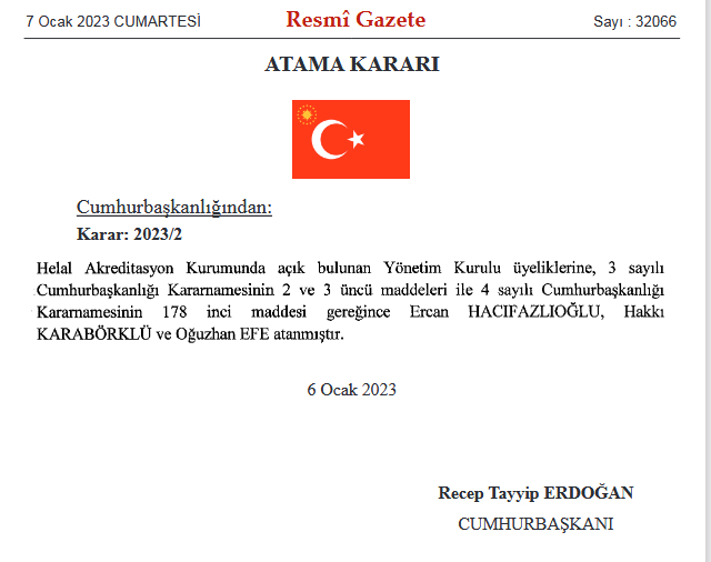 Cumhurbaşkanı Recep Tayyip Erdoğan imzasıyla yayımlanan karara göre; Ercan Hacıfazlıoğlu, Hakkı Karabörklü ve Oğuzhan Efe Helal Akreditasyon Kurumu yönetim kurulu üyeliklerine atandı.