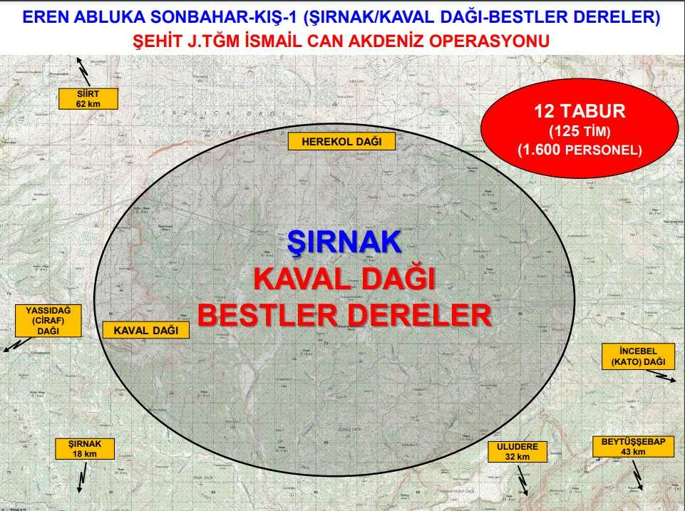 İçişleri Bakanlığı, Eren Abluka Operasyonları'nda 'Sonbahar Kış' Operasyonunun ilkini Şırnak’ta başlattı. Bakanlık, Şehit J. Tğm. İsmail Can Akdeniz adı verilen ilk operasyonda 2 teröristin silahlarıyla birlikte etkisiz hale getirildiğini ve çok sayıda malzemelere el konulduğunu duyurdu.