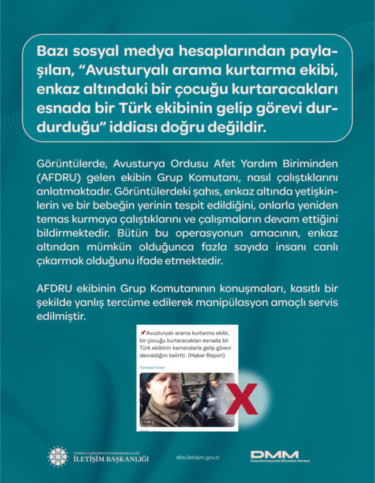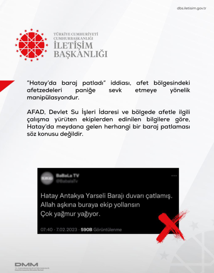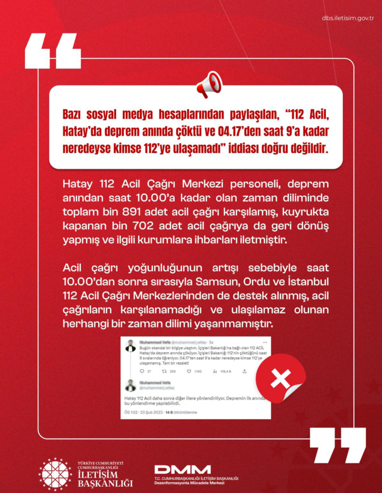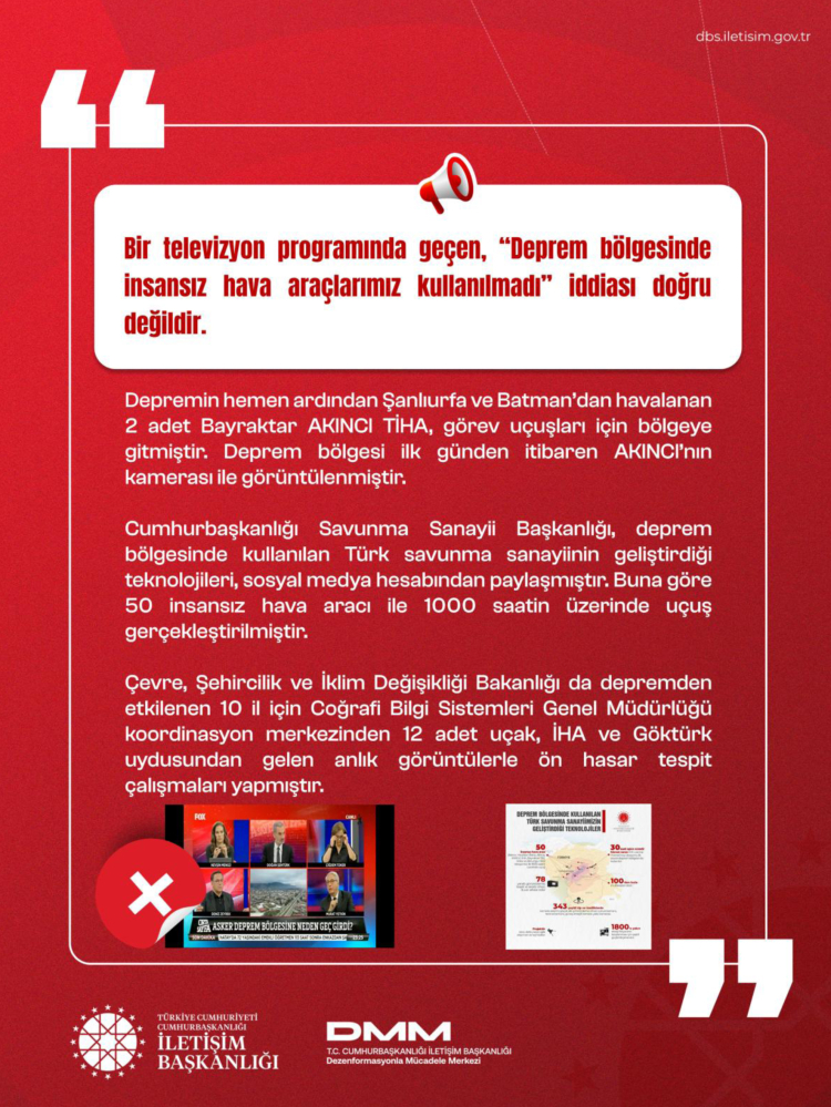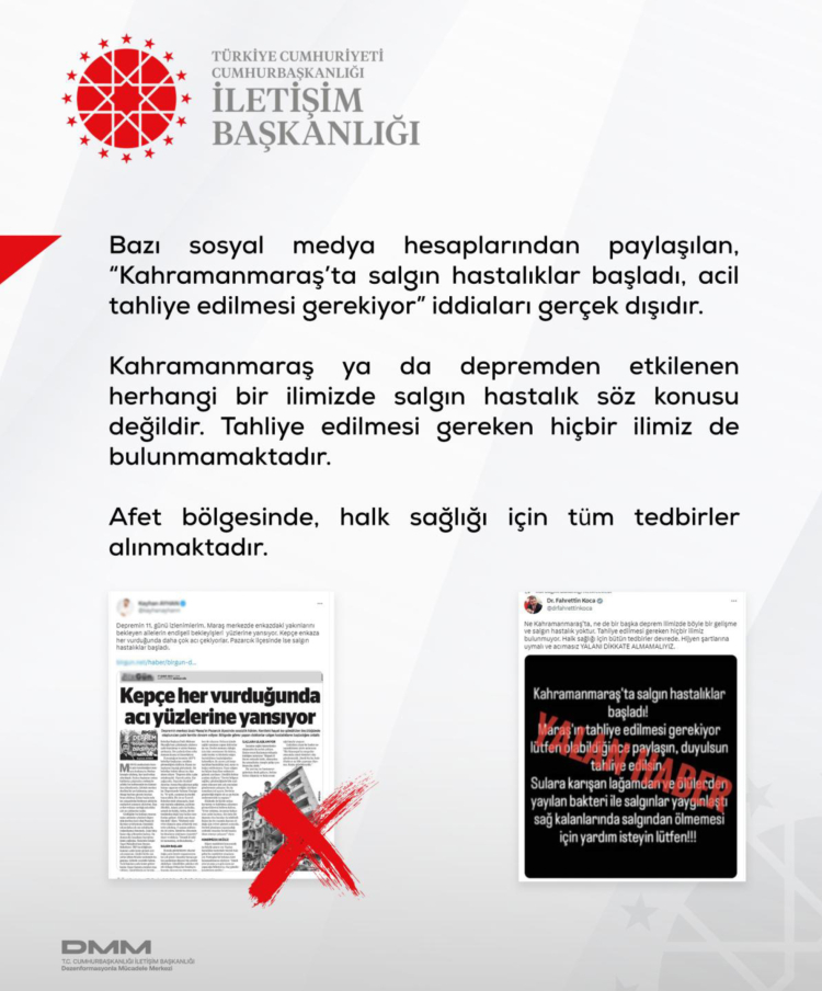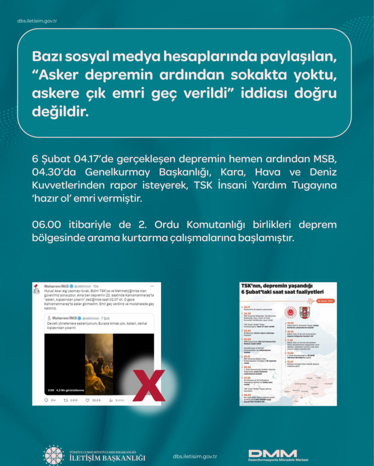 Kurum bünyesindeki Dezenformasyonla Mücadele Merkezi (DMM), afet sürecinde ortaya çıkan yaklaşık 200 dezenformasyon iddiasının gerçek verilerle çürütüldüğünü duyurdu.