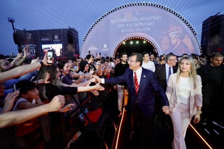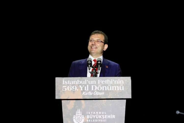 Mehteran gösterisinin ardından, eşi Dilek İmamoğlu ile el ele konuşma yapacağı platforma çıkan İmamoğlu, “569 yıldır hepimizin göz bebeği, evimiz ve vatanımız olan bu muhteşem şehrin, yüz yıllardır sayısız milleti cezbetmiş olan İstanbul’un fetih yıldönümü kutlu olsun. Dünyanın en değerli noktasındaki bu emsalsiz şehri fethederek bizlere armağan eden, çağ açıp çağ kapatan yüce Fatih Sultan Mehmet Han’a selam olsun. Selam olsun, İstanbul’u fetheden o güzel komutana. Selam olsun ‘Onu fetheden güzel orduya” ifadelerini kullandı.