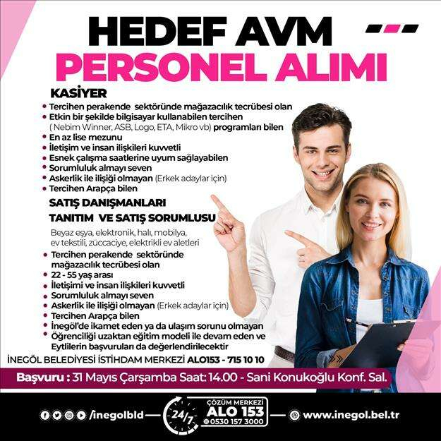 İnegöl Belediyesi İstihdam Merkezinden yapılan açıklamada, İnegöl’de hizmet vermeye başlayacak Hedef AVM firmasında çalışmak üzere personel alımı yapılacağı duyuruldu.