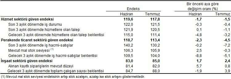 Mevsim etkilerinden arındırılmış güven endeksi Temmuz ayında bir önceki aya göre; hizmet sektöründe yüzde 1,5 ve perakende ticaret sektöründe yüzde 4,5 azalırken, inşaat sektöründe yüzde 2,4 arttı.