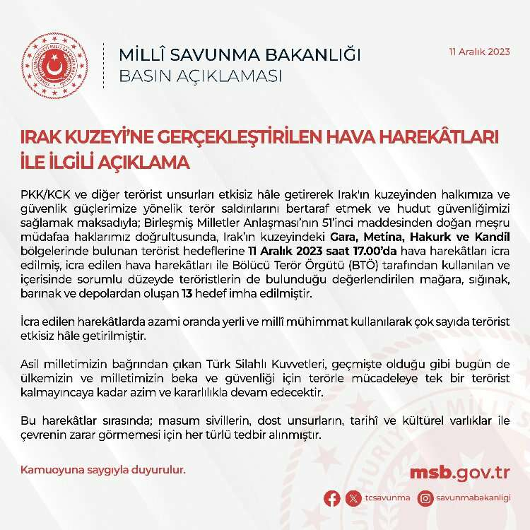 Bakanlıktan yapılan yazılı açıklamada hava harekatı ile Bölücü Terör Örgütü (BTÖ) tarafından kulanılan ve içerisinde sorumlu düzeyde teröristlerin de bulunduğu değerlendirilen mağara, sığına, barınak ve depolardan oluşan 13 hedefin imha edildiğini bildirdi.