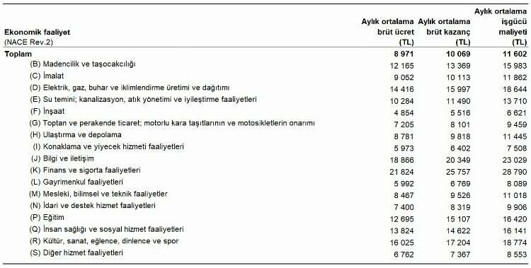 2022 yılında aylık ortalama işgücü maliyeti olarak açıklanan 11 bin 602 TL'de finans ve sigorta faaliyetleri (K) sektörü, 28 bin 790 TL ile aylık ortalama işgücü maliyetinin en yüksek olduğu sektör oldu. Bu sektörü, 23 bin 29 TL ile bilgi ve iletişim (J) ve 18 bin 774 TL ile kültür, sanat, eğlence, dinlence ve spor (R) sektörleri izledi. İnşaat (F) sektörü ise 6 bin 621 TL ile aylık ortalama işgücü maliyetinin en düşük olduğu sektör oldu. Bu sektörü 7 bin 508 TL ile konaklama ve yiyecek hizmeti faaliyetleri (I) ve 8 bin 89 TL ile gayrimenkul faaliyetleri (L) sektörleri takip etti.