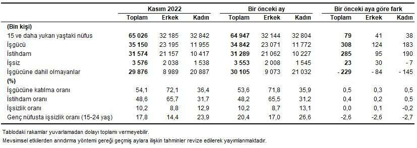 Hanehalkı İşgücü Araştırması sonuçlarına göre; 15 ve daha yukarı yaştaki kişilerde işsiz sayısı 2022 yılı Kasım ayında bir önceki aya göre 23 bin kişi artarak 3 milyon 576 bin kişi oldu. İşsizlik oranı ise değişim göstermeyerek yüzde 10,2 seviyesinde gerçekleşti. İşsizlik oranı erkeklerde yüzde 8,8 iken kadınlarda yüzde 12,9 olarak tahmin edildi.