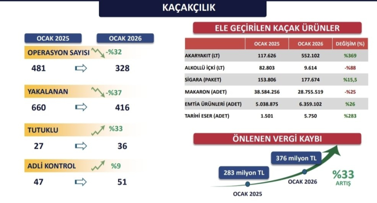 İSTANBUL (İGFA) - İstanbul Valiliği, güvenlik güçlerinin kaçakçılıkla mücadele kapsamında yürüttüğü başarılı çalışmaların 2026 yılının ilk ayına ilişkin sonuçlarını kamuoyuyla paylaştı. Valilik tarafından yapılan açıklamada, önlenen vergi kaybının geçen yılın aynı ayına göre yüzde 33 oranında arttığı belirtildi.