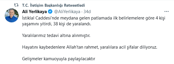 İstanbul Valisi Ali Yerlikaya, İstiklal Caddesi'ndeki patlamada ilk belirlemele göre 4 kişinin hayatını kaybettiği, 38 kişinin yaralandığını açıklamıştı. Cumhurbaşkanı Erdoğan, 6 kişinin hayatını kaybettiği, 53 yaralının olduğunu kalleş saldırının faillerini yakalamak için çalışmaların başladığını duyurdu. Radyo ve Televizyon Üst Kurulu (RTÜK) Başkanı Ebubekir Şahin, İstiklal Caddesi'nde meydana gelen patlama üzerine "yanlış bilgi paylaşmama" uyarısı yaptı.