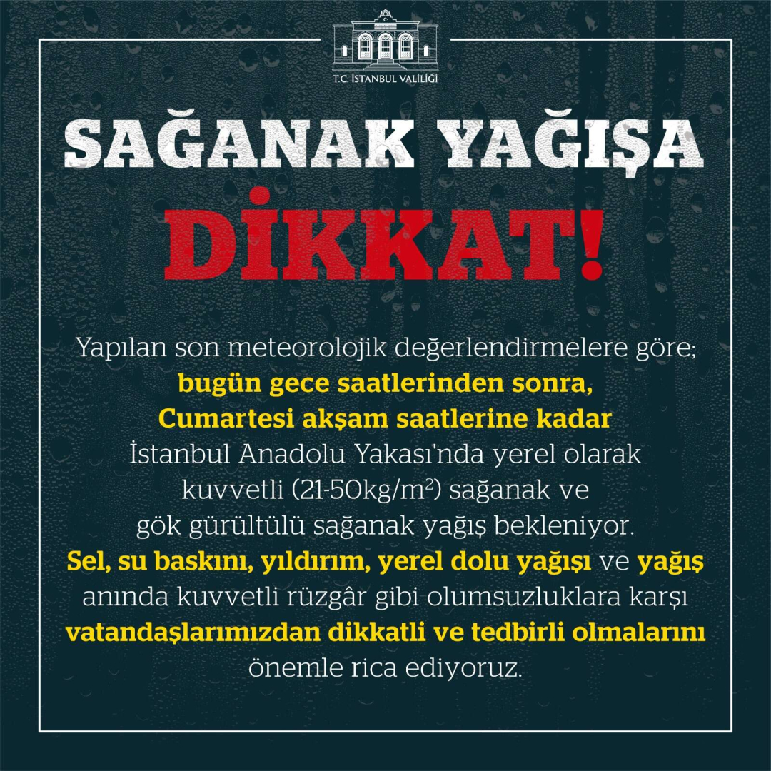 Valilikten yapılan açıklamada, gece saatlerinden sonra 17 Haziran Cumartesi akşam saatlerine kadar İstanbul Anadolu Yakası'nda yerel olarak kuvveli sağanak ve gök gürültülü sağanak yağışbeklendiğini duyurdu.