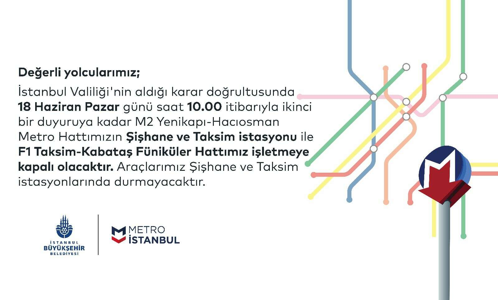 Metro İstanbul, bugün Yenikapı-Hacıosman Metro Hattı'nın Şişhane ve Taksim istasyonları ile Taksim-Kabataş Füniküler Hattı'nın işletmeye kapatılacağını duyurdu.
