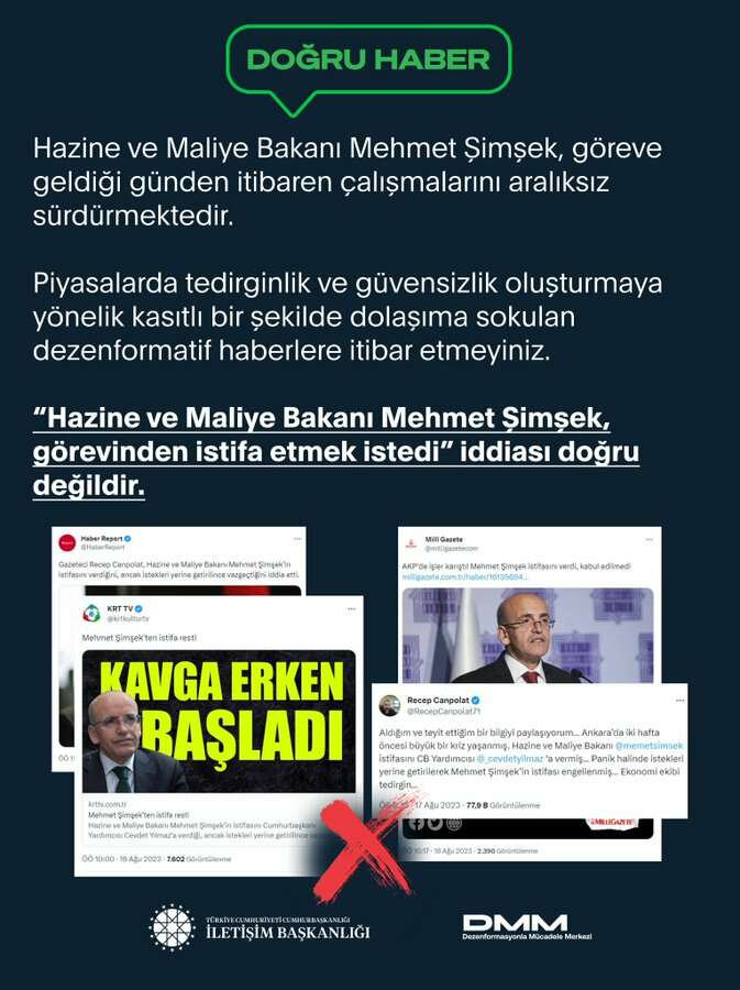 Piyasalarda tedirginlik ve güvensizlik oluşturmaya yönelik kasıtlı bir şekilde dolaşıma sokulan dezenformatif haberlere itibar edilmemesini isteyen Dezenformasyonla Mücadele Merkezi, Hazine ve Maliye Bakanı Mehmet Şimşek'in görevinden istifa etmek istediği yönündeki iddiaların doğru olmadığını açıkladı.